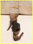 It was not only binding waste that was repurposed in library and archive collections: recycled clothing and textiles often feature in binding construction, with linen and printed cotton waste being used for seal protection, spine linings, endbands and in some cases early textile book covers. I have subsequently – and excitingly – discovered that ecclesiastical robes were used for repairs to the St Catherine’s Monastery collections in Sinai (1).